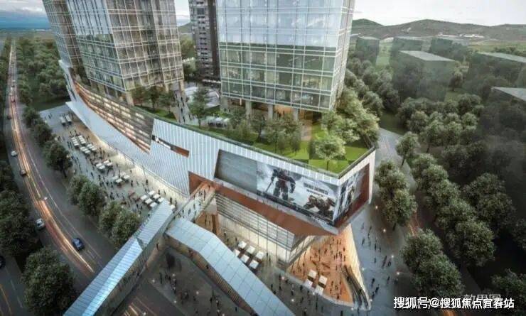 【办公体】:办公和商业空间灰色气质,办公楼折线开口设计使大面积的玻璃立面生动活泼且具有现代感;竖线条更加突显建筑的高耸挺立。