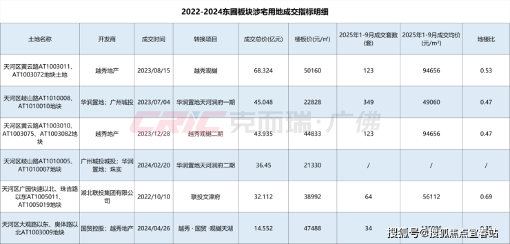 6宗宅地目前已有5宗转化入市,在这其中,华润置地天河润府一期今年1-9月成交349套,成交均价49060元/㎡,地楼比0.47。