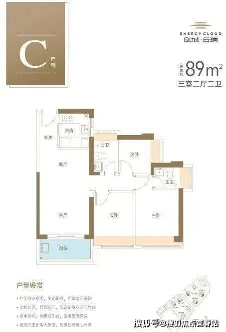 89㎡的3房2厅2卫,设计的是经典竖厅格局,进门入户玄关,客厅3.5米开间,LDKB一体化设计,三开间朝南,动静分区,3个卧室分别做到了主卧11.23㎡/次卧9.1㎡/次卧5.64㎡(实测面积,去掉墙体),U型厨房,卫生间干湿分离,得房率约73.29-73.86%(不含赠送),西南或东南朝向。