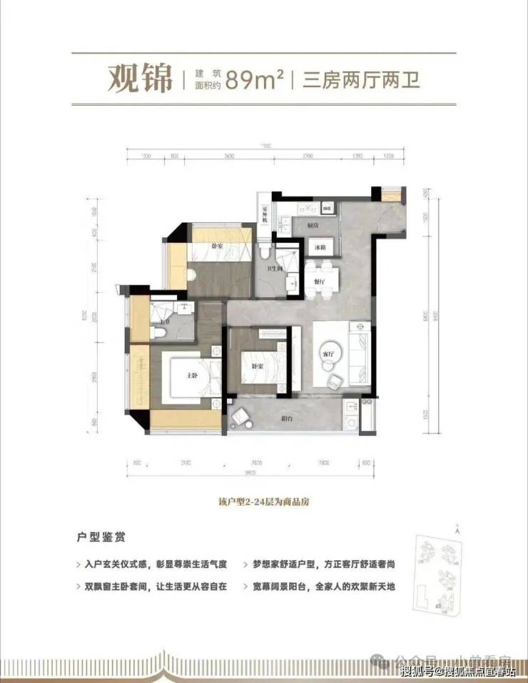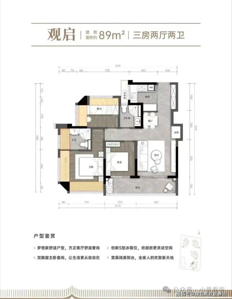 【建面约89㎡的三房两厅两卫】:竖厅格局,动静分区,厨房做的半开放式的,可开可合;景观双阳台连接次卧,还有一个次卧也是双飘窗;主卧带独立卫生间,空间也更大。