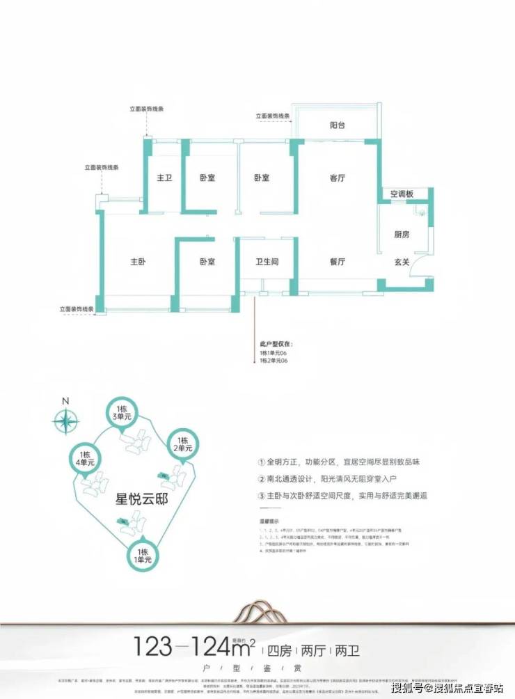 123㎡的4房2厅2卫,设计的竖厅南北通透格局,进门独立入户玄关,全屋飘窗设计,U型厨房,得房率:78.15%(不含赠送),阳台主朝东北向。