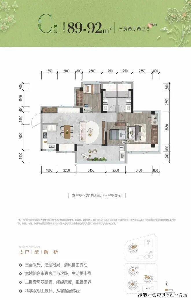 89-92㎡的3房2厅2卫,C户型,设计的是横厅南北通透格局,进门入户玄关,客餐厅5.7米开间,LDKB一体化设计,主卧套房双飘窗,3个卧室分别做到了主卧18.5㎡/次卧7.7㎡/次卧6.9㎡(包含墙体飘窗),客厅连接次卧出5.75米长的巨幕大阳台,U型厨房,科学双明卫,得房率约102-105%(包含赠送),阳台主朝东南向。