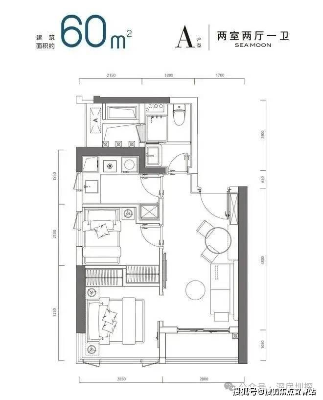 望海玥」首推公寓389套,高度为35F,户型为36-44-46-60㎡的1-2房,精装交付。