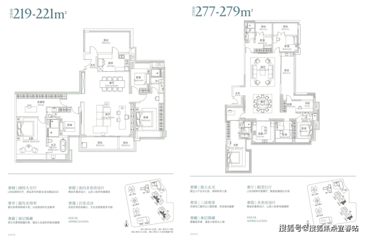 122-124㎡通透4房2卫(可改3卫),123-129㎡竖厅4房2卫(可改3卫),140-144㎡竖厅4房2卫(可改3卫),144-145㎡竖厅5房2卫(可改3卫),188-190㎡4房3卫,219-221㎡和227-279㎡大平层户型。