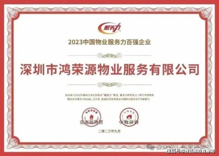中国百强物业:鸿荣源物业为国家物业管理一级资质企业,2018-2023连续六年中国物业服务百强企业。