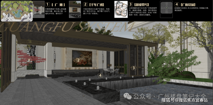 ,融入广雕、千年广绣、广府花窗设计,如广雕对景照壁源于余荫山房抽象龟纹石雕,寓长寿之意、镇宅安宁;广府花窗,寓意满堂富贵等,代表广府的美好祝愿