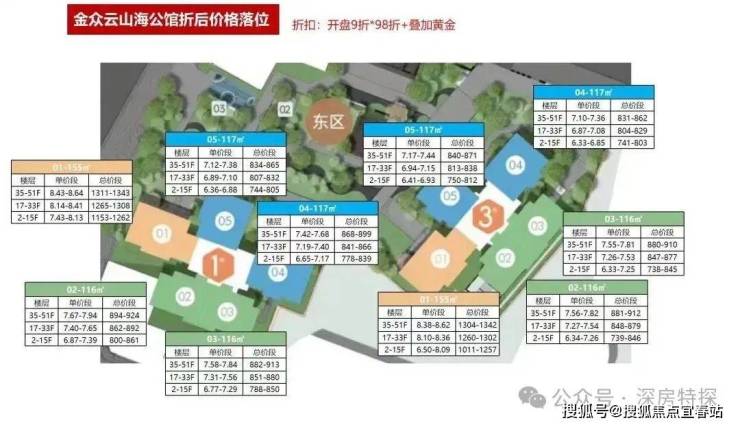 【产品面积段】116-117m'四房,155m'五房梯户比】西区2梯4户、3梯6户 东区35户