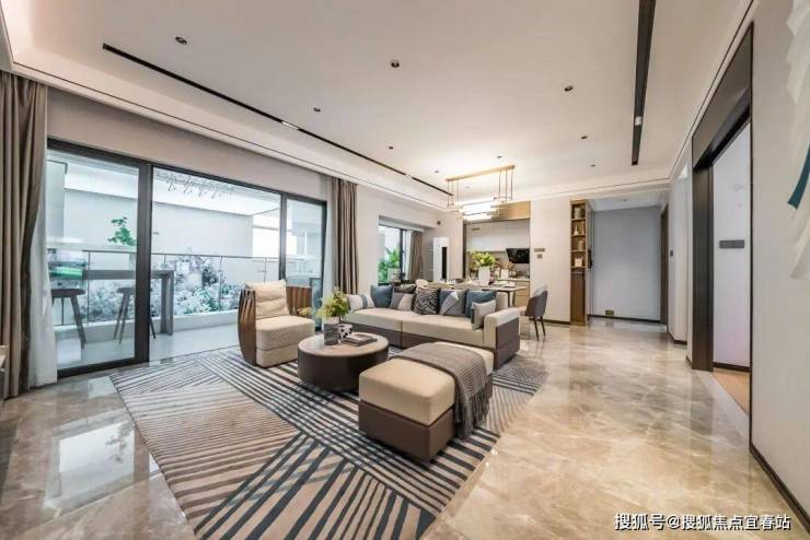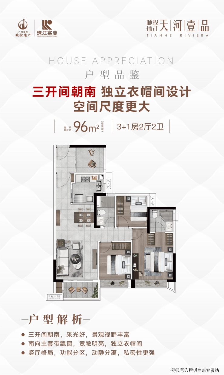 :动静分离的设计,三开间朝南,格局方正,多一房可作书房、茶室等,单价约为650-720万元。