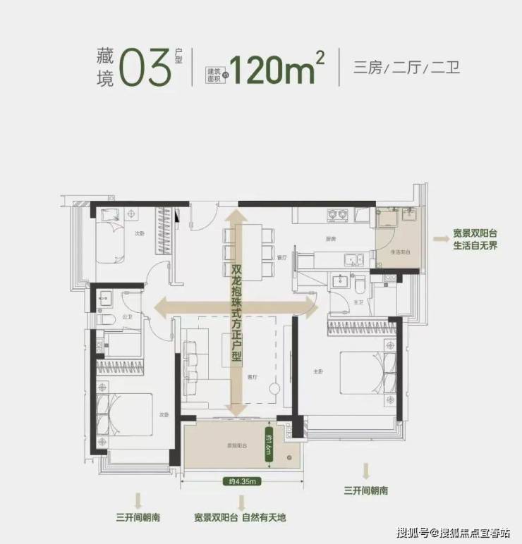 03户型 约120㎡3房2卫:双龙抱珠户型,三开间朝南,双阳台设计