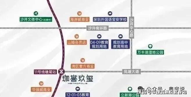 项目位于沙井新桥,珈誉府本身是一个大型综合体,自身配套丰富,自带50万㎡大型商业;地铁11号线塘尾站挨着项目,深圳外国语宝安学校在项目南北两侧,且靠近万丰湖、立新湖,有生态资源。