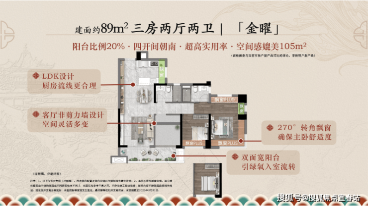 · 89㎡三房两厅两卫:竖厅布局动静分区,四开间朝南,主卧带270°转角飘窗,厨房竖窗改横窗增加采光,烟道外挂释放室内空间。市面上少见的南北对流户型,适合首置家庭。