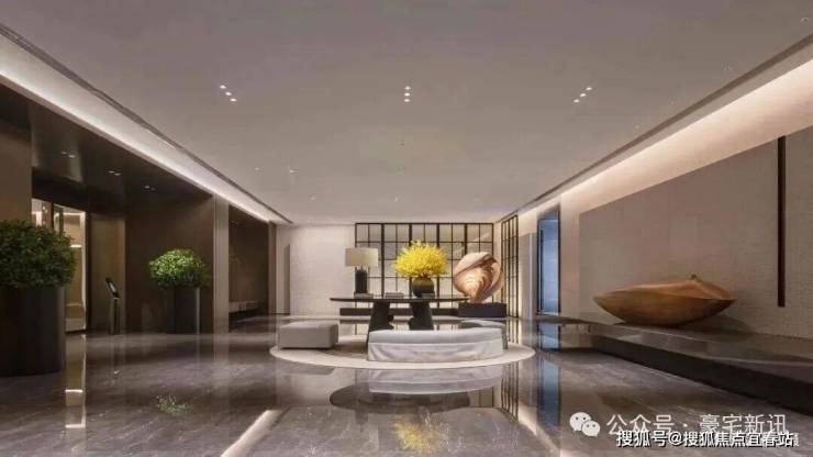 顶奢酒店式入户大堂,石材铺装,打造尊崇的三重归家礼序,开敞阔绰奢豪,点缀多元艺术美陈。