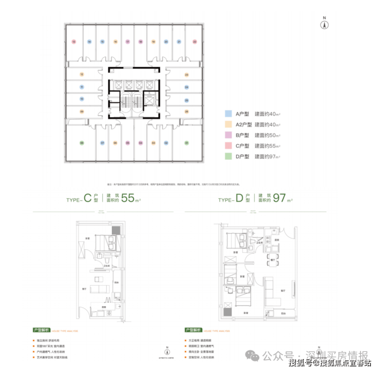 为满足不同家庭结构和居住需求,深业上林苑提供建面约40 - 97㎡的1 - 3房 公寓产品。每一种户型都经过精心设计和优化,注重空间的合理利用和功能的分区,保证了 每个房间都有充足的采光和通风。客厅和餐厅相连,形成通透的公共活动空间,方便家人交 流互动。部分卧室配备独立的卫生间和衣帽间,厨房和卫生间设计人性化,操作台面宽敞, 收纳空间充足。