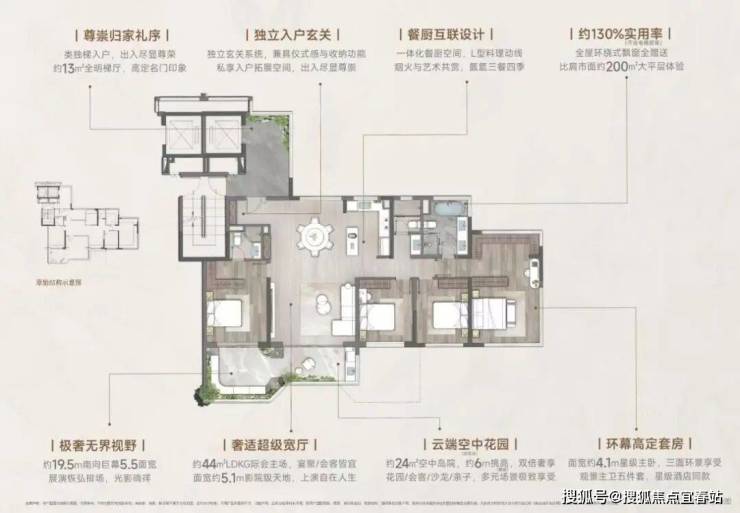 【139㎡云颂】以约44㎡无界宽厅划写天际线,约19.5米环幕视界打破空间桎梏。奢适主卧套间三面环景,270°环幕飘窗私藏四时光影,以约139㎡空间容器承载约200㎡奢居想象;