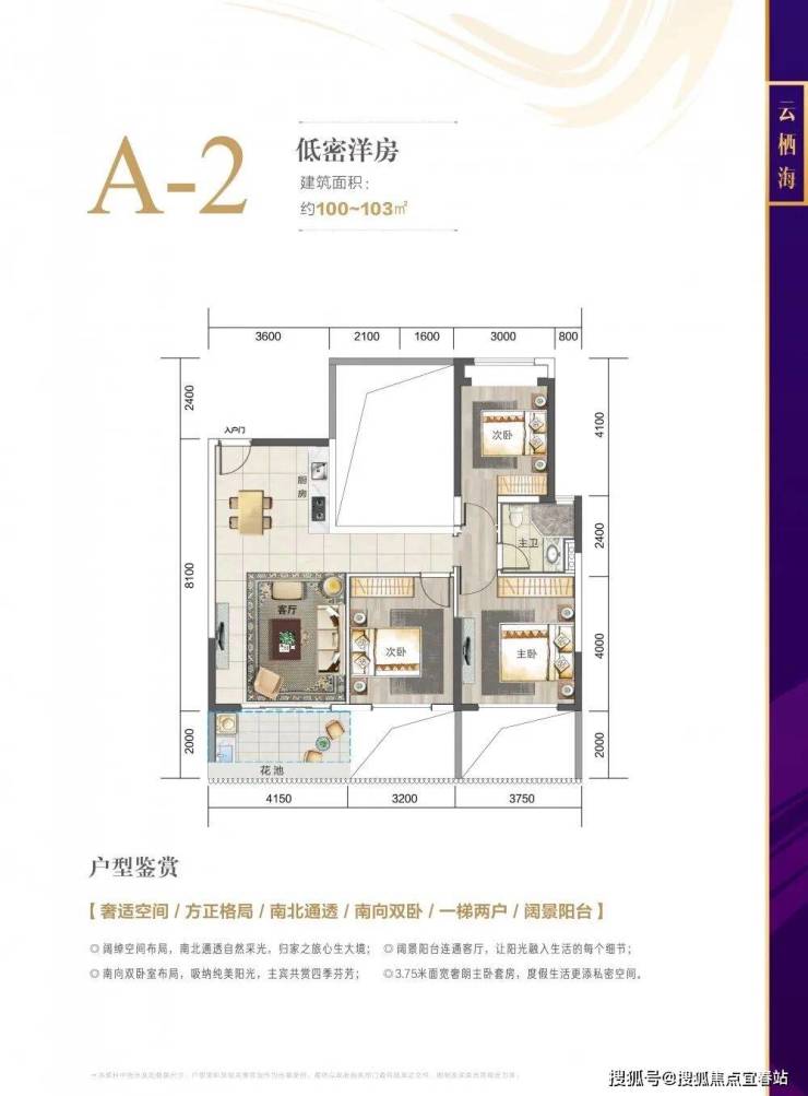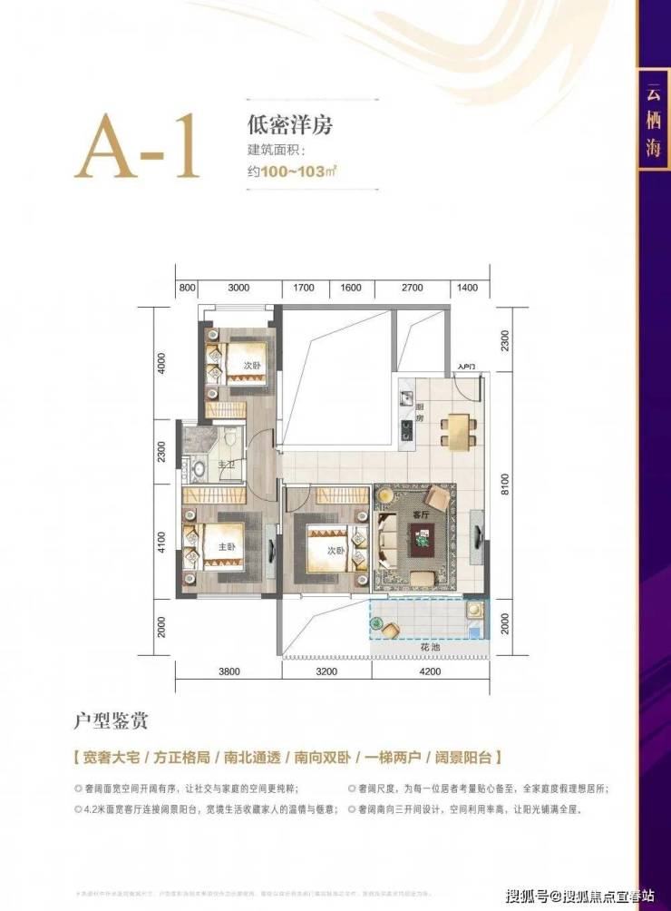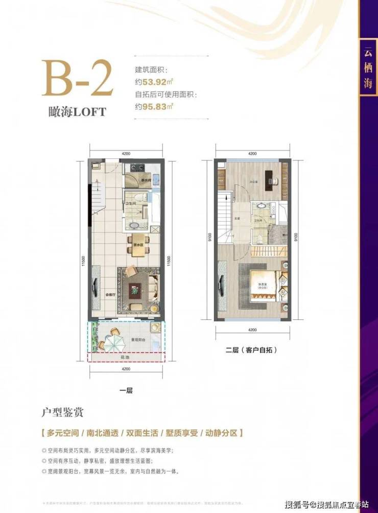 约54-76㎡瞰海LOFT,买一层送一层;约100-103㎡板式洋房,一梯两户,匠筑高舒适度居住体验;约252㎡双拼别墅,前庭后院,观山瞰海,全家庭度假悦享。