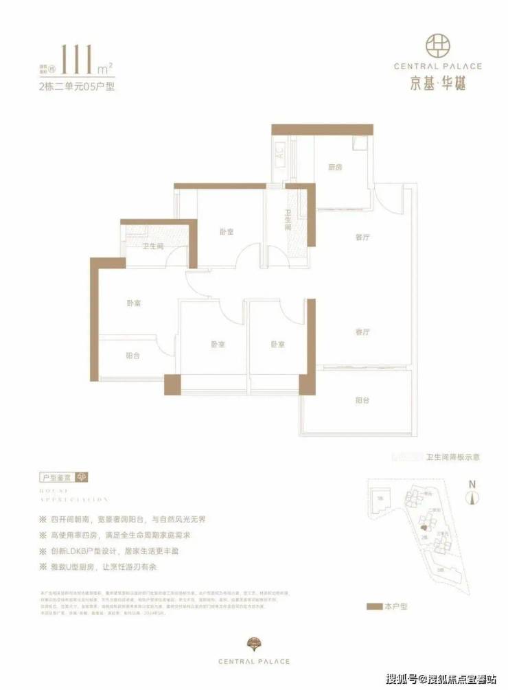 仅2栋2单元05户型才有,设计的是经典竖厅格局,LDKB一体化,动静分区,四开间朝南,U型厨房,卫生间干湿分离,得房率约73%(不含赠送),阳台西南朝向。