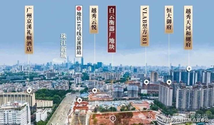项目位于白云怡新路和沙太中路的交汇处,就在越秀云悦的对面,这块地就是今年4月30日越秀拿下的衡器厂地块,成交楼面价为3.4万/平,比之前云悦地价更贵,相对云悦来说,云萃这块地体量更大,配建更少,可以说是云悦二期,也能说是云悦升级版,不过云萃没有配建学校,需要统筹周边的小学,这里一路之隔就是天河,与珠江新城直线距离仅仅5公里,家楼下就是在建的地铁18号线北延段京溪路站,交通非常方便