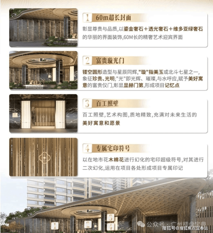 越秀云萃以多重奢石打造的60米超长封面把大门变成城市橱窗。所有人走近它,都会直面鎏金奢石,维多亚绿奢石,以及富贵璇光门、百工照壁等珍贵石材及工艺带来的气场。