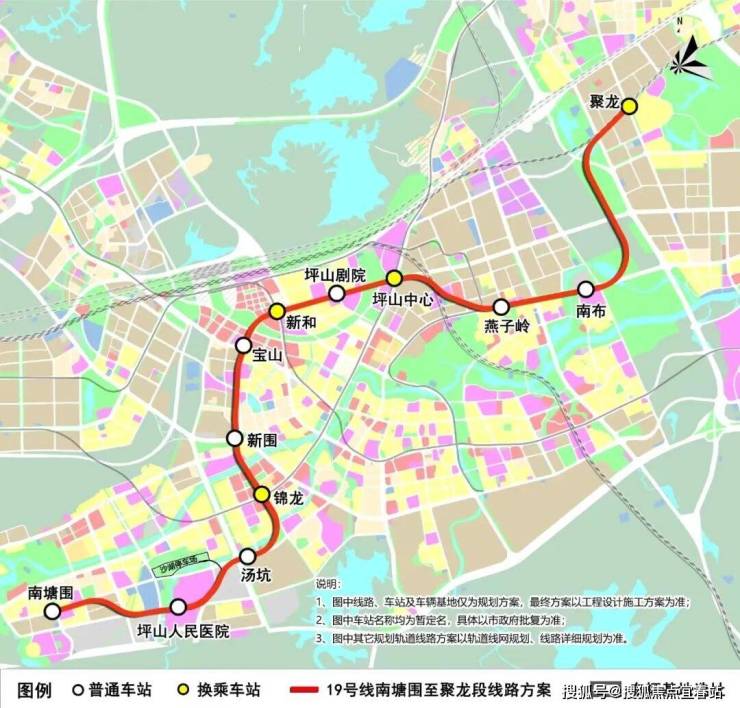 该线路总共规划12座车站,包括南塘围,坪山人民医院,汤坑,锦龙,新围,宝山,新和,坪山剧院,坪山中心,燕子岭,南布,聚龙站,时速80公里。