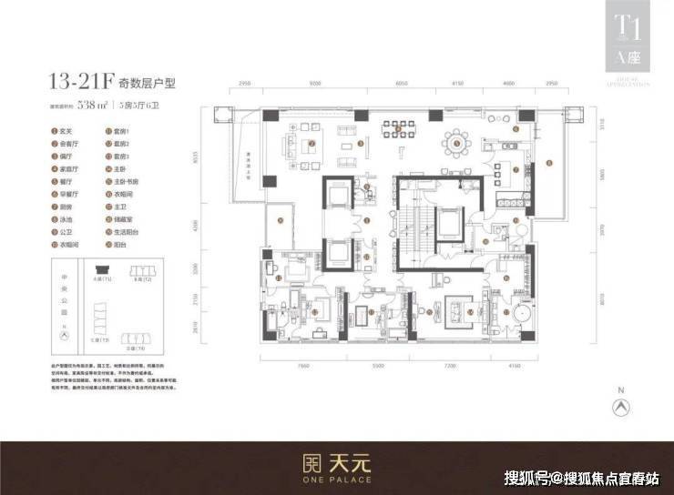 13-21F奇数层户型:538平 五房五厅六卫,南北通透