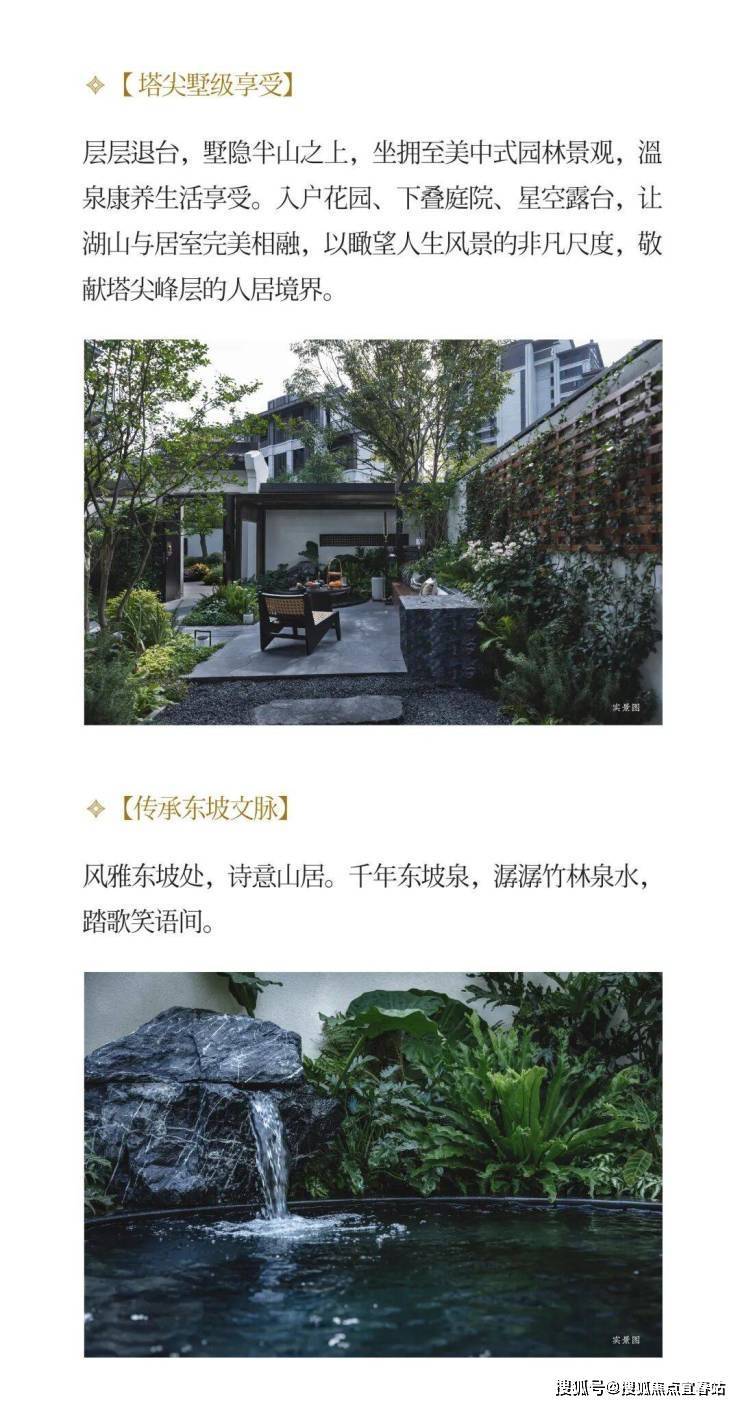 项目内部拥有双重园境,外园东坡九境,内园私家庭院,引入水系滨水长廊 ,打造“一径一园三溪六院”的景观布局,让每户都可以享受庭院景观。户型设计上,南北通透,温泉入户,打造开阔的前庭后院和景观露台。