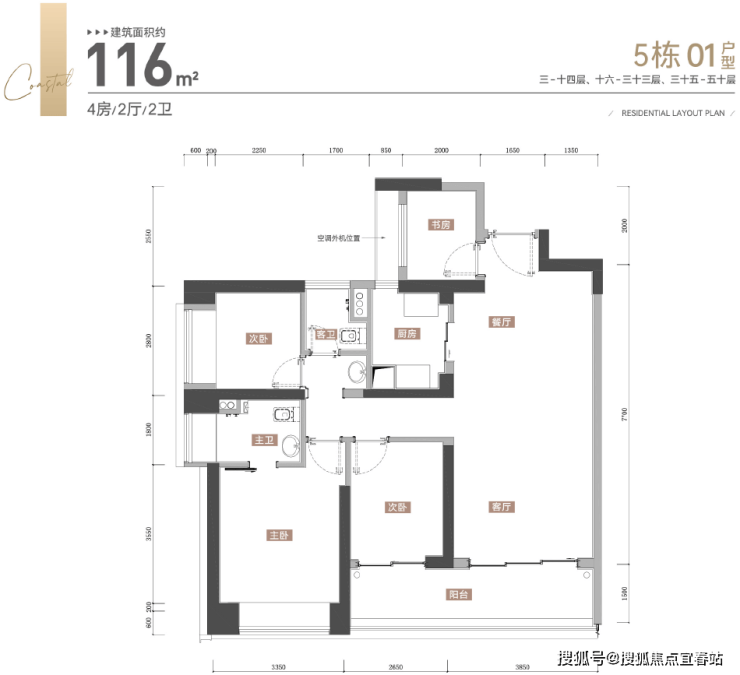 其中,建筑面积约116㎡的4房2卫,是万丰海岸城本次推出的面积最小户型,经典的竖厅格局,动静分区,进门处是一个小房间后期可以打造成书房,厨房连接餐厅,餐客厅一体化,南向约6.5米大阳台连接次卧,主卧带独立卫生间,这个户型最大的亮点就是客厅很大,客厅开间约3.85米。这个户型主要分布在01和02户型,客厅都是西南朝向看小区花园、海岸公园、万丰海岸城商业和深圳外国语宝安学校。