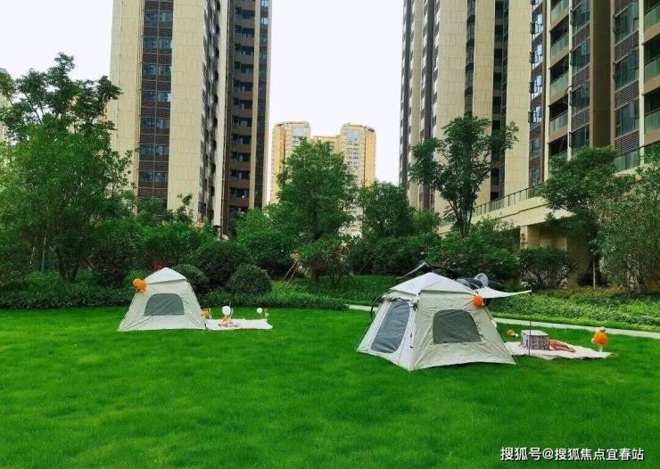 从入口处拾级而上,就是层叠的水景,有一个好听的名字—树心池,有点像一个浅浅的许愿池,未来住进来后,孩子们应该会非常喜欢在这个区域玩耍,整个园林以探索和童趣为主题,像一个巨大的游乐空间,大草地上还摆放了几个帐篷,休闲感特别足,这也是孩子们喜欢的。