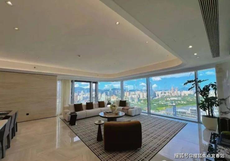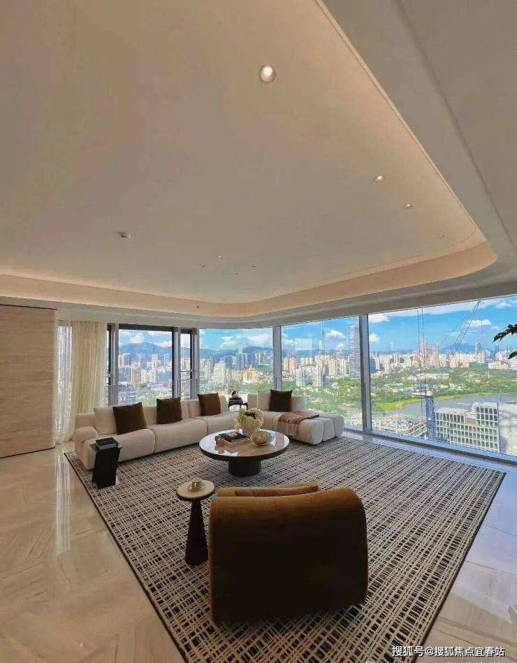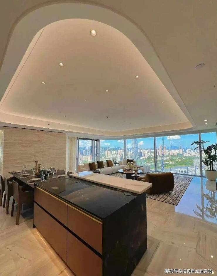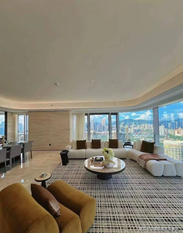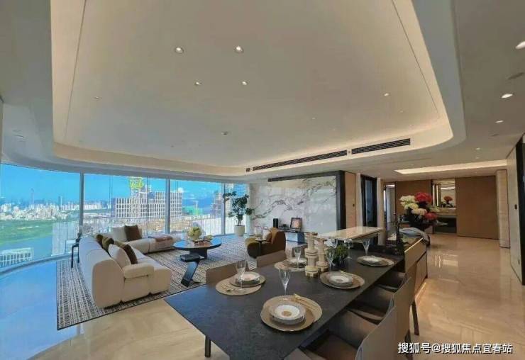 1️⃣整个售楼部和样板间品质都很高:270°弧形全景落地窗,客餐一体的面积将近一百平,视觉观景+居住体验拉满。