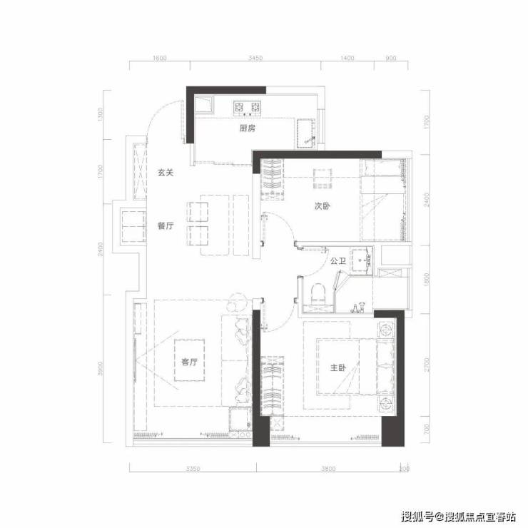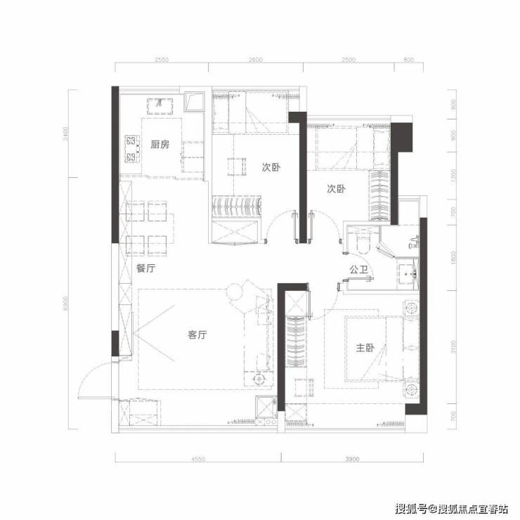 前沿S墙设计,预留冰箱位,空间零浪费;约3.8米面宽大主卧待飘窗