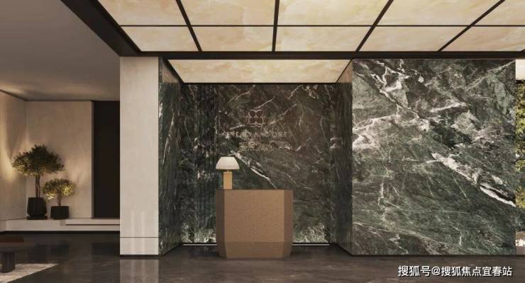 大堂墙体普拉达绿奢石 ,质地坚硬而耐用,搭配古铜色铝板,气质高贵而典雅。