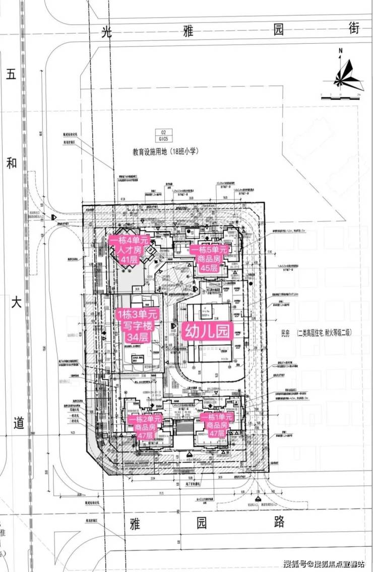 天璞世纪雅园小区2栋楼共分为4个单元,其中商品房3个单元,人才房1个单元41层,还有1栋办公楼、1所幼儿园。小区北边规划有18班小学一所。