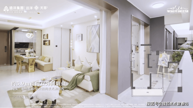 客厅3.5米开间,LDK一体化,客厅连接次卧出5.9米双开间大阳台,次卧270°转角飘窗。