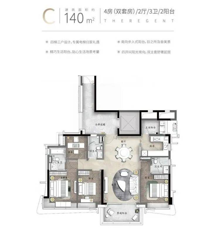 『天启』组团面积约140-250㎡环幕临江大平层,坐拥江景第一排,眺望小蛮腰,享500米宽阔无遮挡江景视野,并邀请三大全球知名设计大师倾力打造,并配备12大国际一线品牌交标,专梯专户四房双套房设计,世界灵感前沿作品礼献广州!