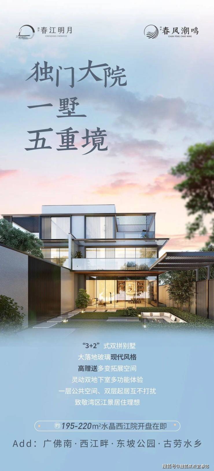 江门鸿升·春江明月春风潮鸣是位于粤港澳大湾区江门鹤山市古劳水乡的高端住宅项目,坐拥一线西江江景及古劳水乡自然风光。项目由高层洋房和现代别墅组成,户型多样,别墅赠送面积高,居住舒适度高。项目交通便利,周边商业、教育资源丰富,是广佛宜居生态腹地的理想选择。
