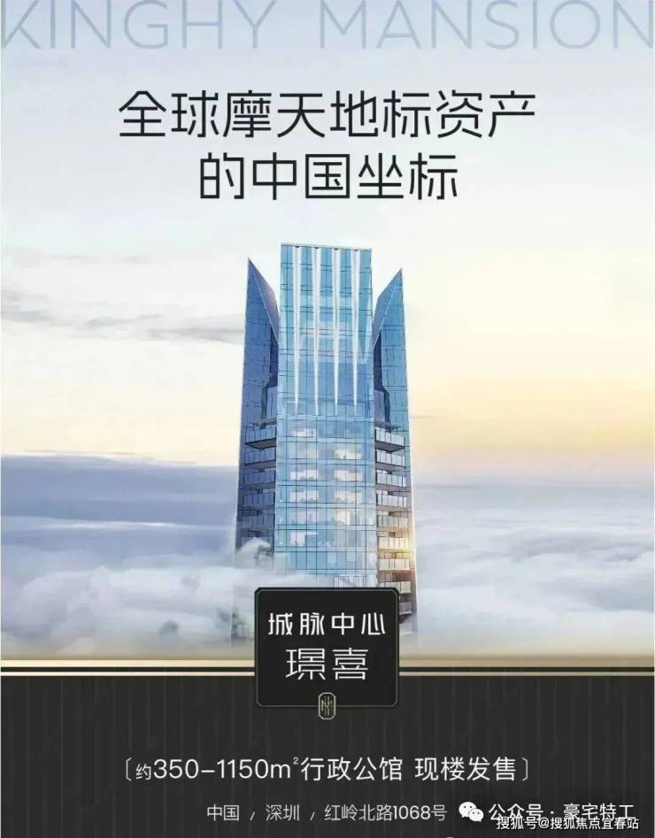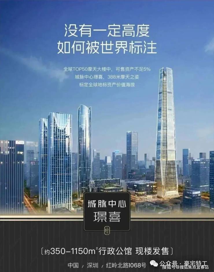 当摩天资产成为国际流通的“价值护照" 世界塔尖的目光,正聚焦中国。 ◆ 全球地标 天际资产◆ 388米深圳天际线地标 城脉中心·璟喜 正以中国资产的世界叙事 重构全球财富坐标 ◆ 超级区位底盘◆ 深圳黄金中轴、世界级金融街之上 福田、罗湖、香港三区资源中心 立足百万方城脉汇的高端商圈配套 铸就璟喜不可复制的资源王座 ◆总裁级行政公馆 ◆ SCDA&CCD双大师设计大平层 户户自带40㎡私人观景台 不仅是纯粹的空间占有 更总裁是对话世界的云端会客厅 匹配全球资产买家眼界与品味