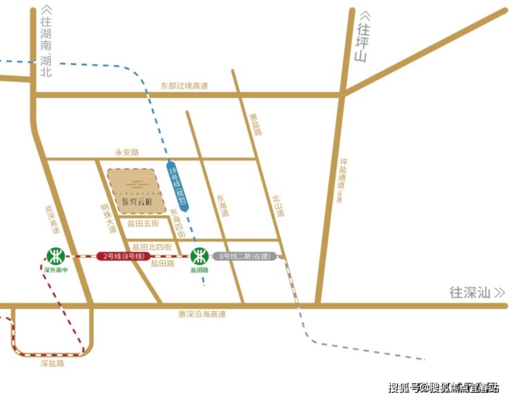 临近地铁8号线、18号线(规划中)双轨交汇枢纽盐田路站;武深高速、惠深沿海高速、东部过境高速、坪盐通道(在建)等高速路网环伺;独享三大口岸、水上停机坪等便捷交通;海陆空轨便捷通勤,轻松执掌深港双城繁华。