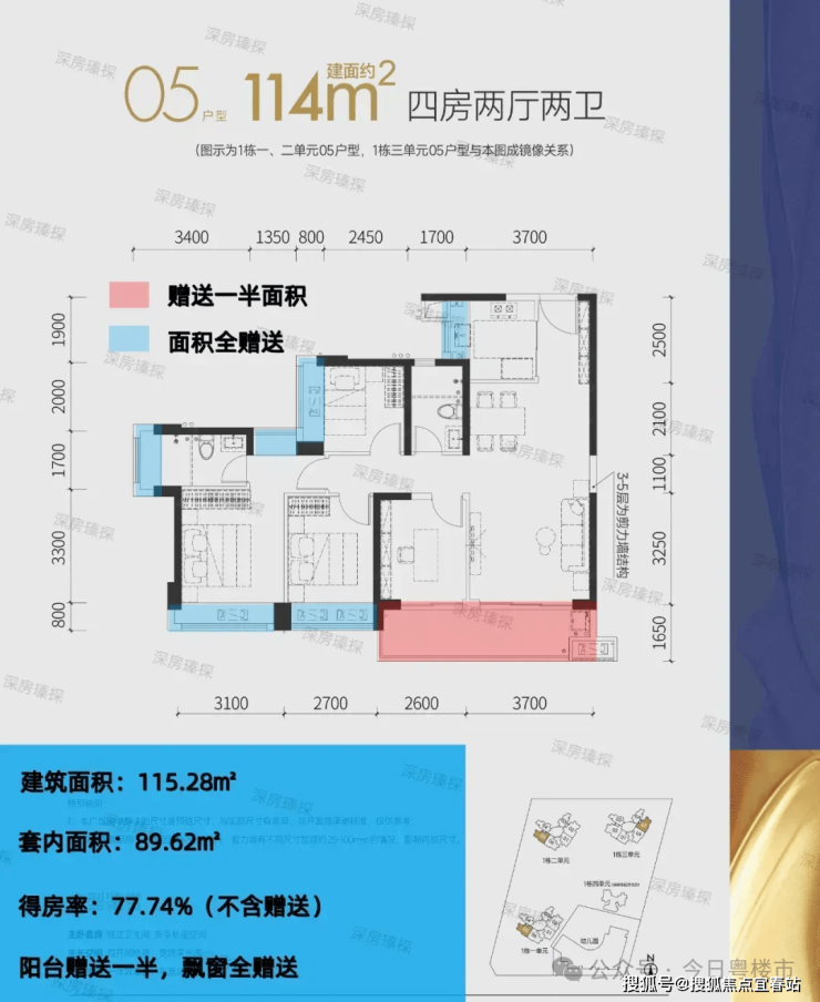 114㎡的4房2厅2卫,设计的竖厅格局,客厅3.7米开间,四开间朝南,动静分区,4个卧室分别做到了主卧14.99㎡/次卧9.39㎡/次卧7.35㎡/次卧7.12㎡(实测面积,不含墙体),客厅连接卧室出6.3米长大阳台,U型厨房烟道外置,卫生间干湿分离,得房率:77.74%(不含赠送),西南或东南朝向。套内面积89.62㎡+赠送面积15.39㎡=实得105.01㎡,加上赠送后得房率约91.1%。