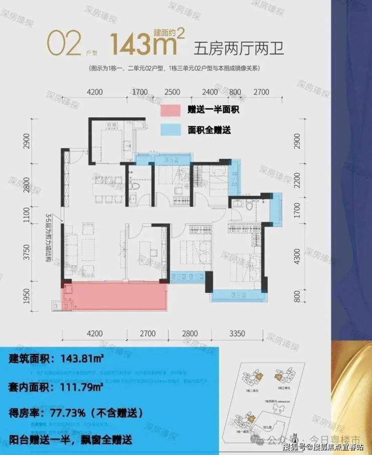143㎡的5房2厅2卫,设计的竖厅格局,客厅4.2米开间,四开间朝南,5个房间分别做到了主卧16.49㎡/次卧9.83㎡/次卧9.4㎡/次卧7.28㎡/次卧7.14㎡(实测面积,不含墙体),客厅连接卧室出6.9米长大阳台,U型厨房烟道外置,卫生间干湿分离,得房率:77.74%(不含赠送),东南或西南朝向。套内面积111.79㎡+赠送面积18.12㎡=实得129.91㎡,加上赠送后得房率约90.33%。