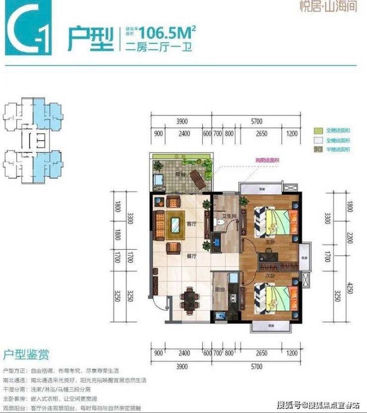 悦居·山海间在售户型面积约为101㎡~106㎡,包括三房两厅两卫和两房两厅一卫两种格局。户型方正,明厨明卫,动静分区合理,阔绰阳台设计,让居住空间更加宽敞明亮。其中,北朝向的三房两厅两卫户型全通透,采光极佳;南朝向的三房两厅两卫户型半通透,视野开阔。购房者可以根据自己的需求和喜好选择合适的户型。