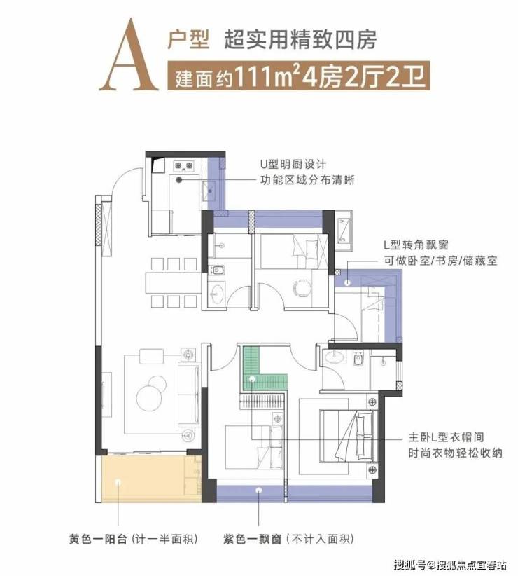 建面约111㎡竖厅4房2厅2卫,打造了极致四房,相对市面上同面积产品常为三房配置而言,为生活和兴趣多预留了“一间房”,把空间发挥到极致,在改善类型产品中难得一见。
