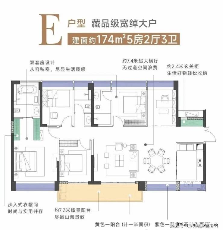 建面约174㎡横厅5房2厅3卫,做到五开间朝南向,夏天享清风,冬日晒暖阳。7.3米超长阳台,搭配约7.4米超大横厅,会客休闲气度十足,观景远眺一览无余。奢侈双主卧套间设计,保障熟人私密性,尊重并平衡两代的生活习性。