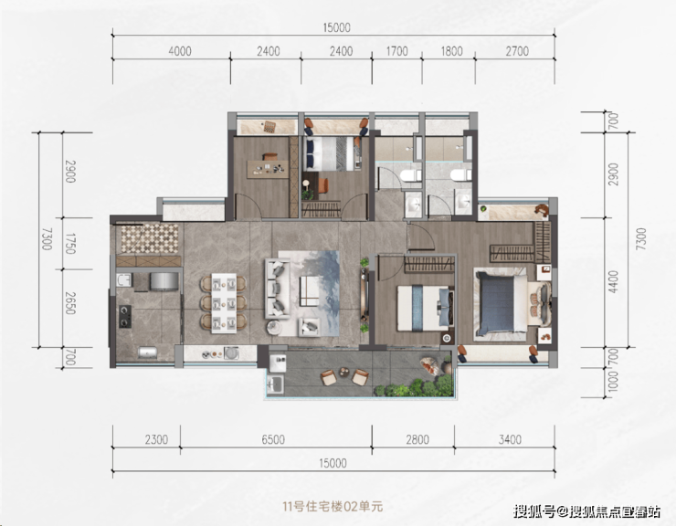 约15米南向采光面,约4.5米横厅+约6.5米全景阳台,星级主卧+灵动次卧,全生命周期适配。