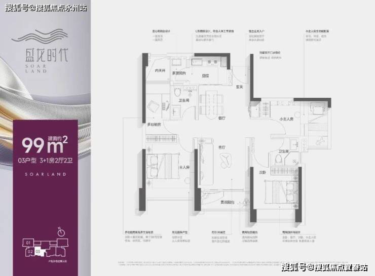 99㎡的3+1房2厅2卫,1栋C座03户型,设计的是竖厅双龙抱珠格局,客厅3.5米开间,进门入户玄关,LDKB一体化,三开间朝南,有1个多功能房间可以改多1个卧室,L型厨房带1个生活阳台,卫生间干湿分离,得房率:约78%(不含赠送),阳台西南朝向。