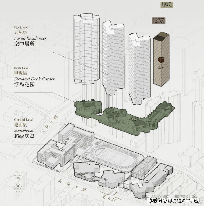 后海招商玺项目采用“浮岛甲板”策略,四栋住宅坐落于抬升的绿化甲板之上,形成“超级社区底盘”与“浮岛绿化甲板”的垂直共生模式,通过“仪式水轴-艺术庭院-空中浮岛森林”三级景观系统,打造“垂直森林社区”,实现建筑与自然的融合。