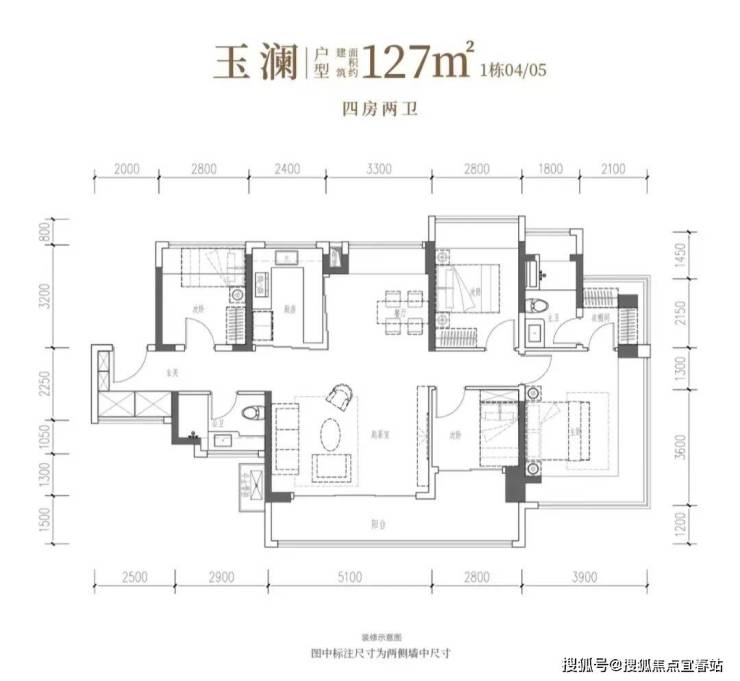 127㎡的4房2厅2卫,设计为南北通透的竖厅布局,设有独立玄关。客厅宽5.1米,客餐厅分离。主卧带270°转角飘窗和衣帽间,面积分别为18.55㎡、11.2㎡、8.96㎡和7.84㎡(含墙体飘窗)。U型厨房外置烟道,卫生间干湿分区。得房率约98.97%(含赠送),客厅与次卧共享14.09㎡大阳台,朝向西南或东南。