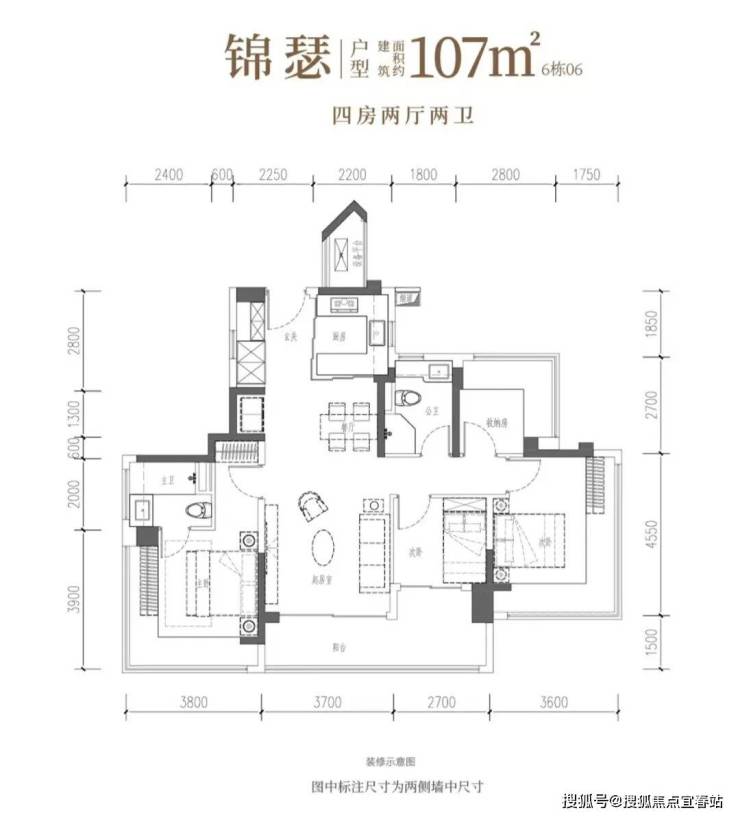 107㎡的4房2厅2卫,设计为竖厅双龙抱珠风格,客厅3.7米宽,采用LDKB一体化布局,预留冰箱位。四室朝南,主卧17.94㎡带270°飘窗,两次卧分别为16.38㎡和7.56㎡,另一次卧6.89㎡。U型厨房外置烟道,卫生间干湿分区。得房率约104.06%(含赠送),客厅连次卧带11.76平大阳台,东北向。