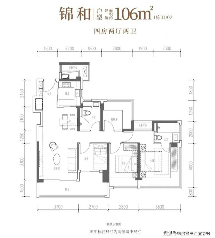 106㎡的4房2厅2卫,竖厅设计,客厅3.7米宽,LDKB一体,南向四开间,动静分区。主卧270°飘窗带1.52㎡平台,面积分别为20.34㎡、11.2㎡、7.7㎡和6.75㎡(含墙体飘窗)。U型厨房外置烟道,卫生间干湿分离,得房率101.16%(含赠送)。客厅连次卧大阳台11.76㎡,东南向。