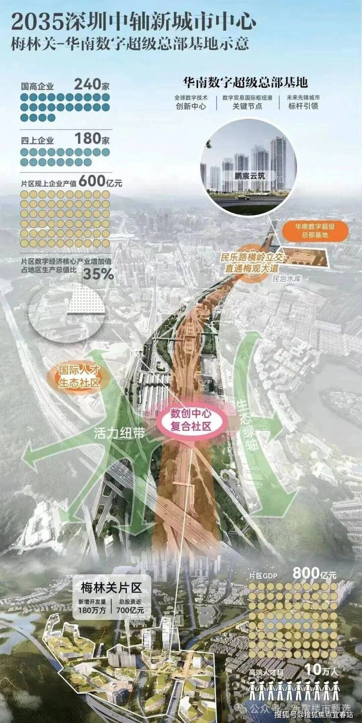 项目所在的港深科创中轴片区定位为千亿级产业规划区,对标深圳湾超级总部基地、腾讯企鹅岛及香蜜湖国际金融中心,是深圳中轴含金量最高的区域之一。周边集聚华南数字超级总部基地、星河World总部基地、坂雪岗科技城、北站产融结合示范区等产业板块,形成数字经济与科技创新的产业高地。作为华南物流园土地整备的首批项目,鹏宸云筑所在的片区将打造超百万平方米产城综合体,涵盖住宅、产业空间及公共配套,未来将吸引海克斯康等企业入驻,推动区域产业升级。
