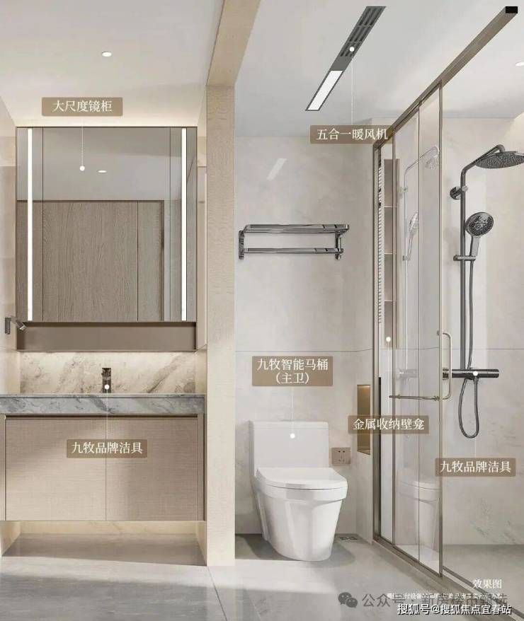 低区俯瞰岭南园林的静谧,高区远望塘朗山的绵延。主卫内,九牧洁具、暖风机与隐藏式地漏等细节,共同营造酒店般的品质体验。