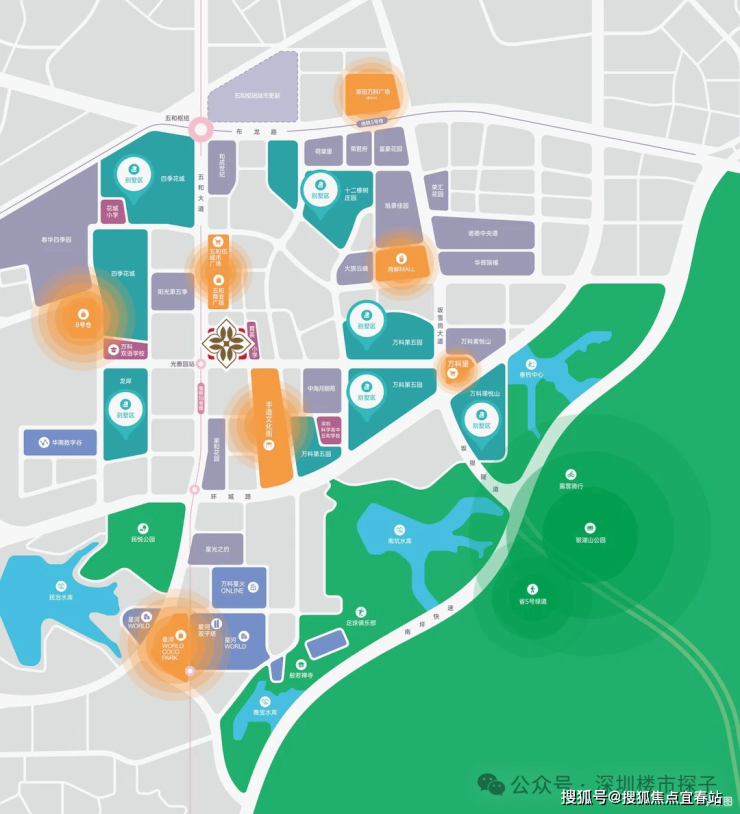 项目南侧约1.4公里(2站地铁)可达星河COCO PARK,这是深圳最具时尚气质的文创主题购物中心,拥有乐活永辉超市、悦享寰宇影城等主力店,2024年新增星空广场、莱特飞行者深圳首店、苹果授权店等业态。此外,距离天虹商场坂田店约1.8公里,周边还有阳光湾畔等小型商业设施。整体来看,项目商业配套覆盖全面,从日常便利到高端消费均有满足,且多为步行或短途地铁可达,极大提升了生活便利性。